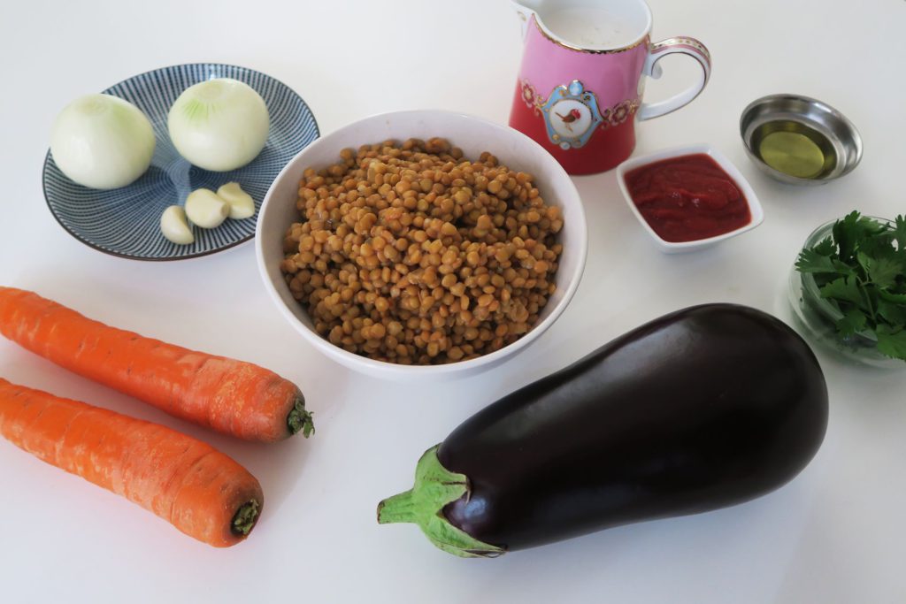 Snipper de ui en de knoflook, snijd de wortel in plakjes en de aubergine in blokjes. Door al het snijwerk eerst te doen bespaar je jezelf een hoop stress tijdens het koken.
