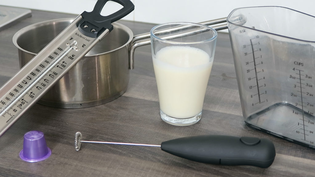 Naast de plantaardige melk en de koffie heb je een groot glas (hittebestendig) en een opschuimer nodig. Als je een handopschuimer hebt heb je ook een steelpannetje nodig. Je kunt de melk daar direct in opschuimen of eventueel in een maatbeker. Bij het gebruik van een handopschuimer is een thermometer ook erg handig. Zonder thermometer is het namelijk lastig in te schatten wanneer de melk op de juiste temperatuur is.